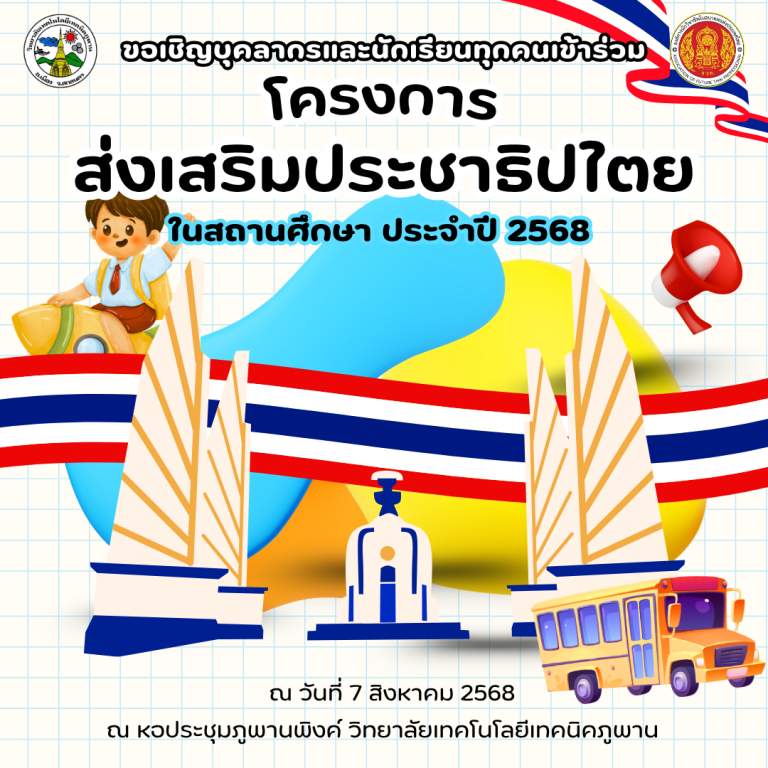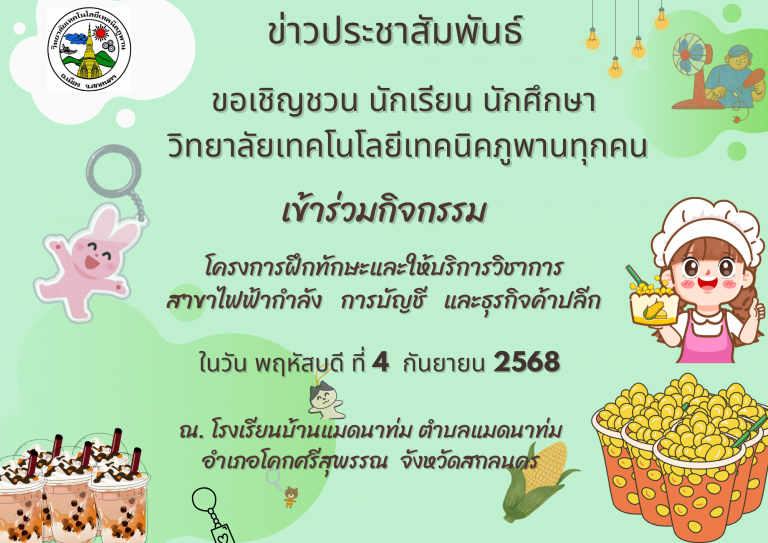 ขอเชิญชวนเข้าร่วมกิจกรรม ในวันที่ 7 สิงหาคม 2568 ณ วิทยลัยเทคโนโลยีเทคนิคภูพาน จ.สกลนคร …
