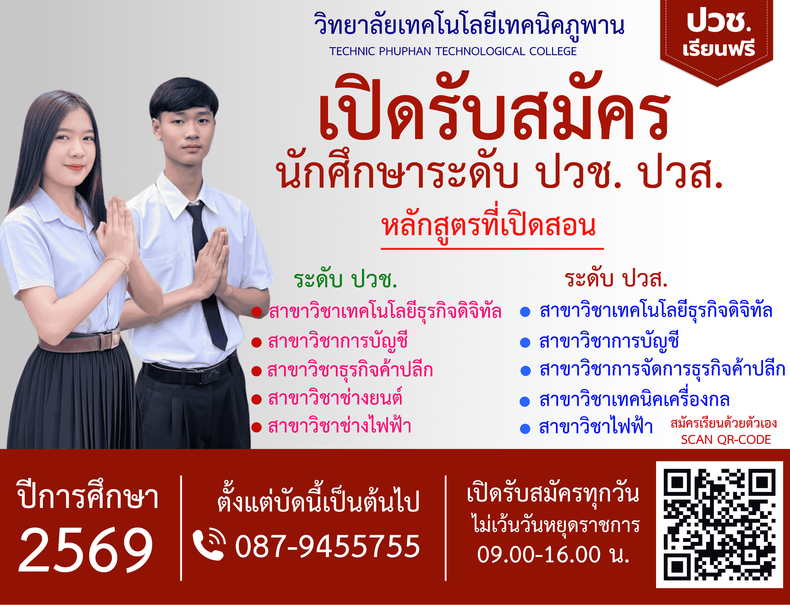 วิทยาลัยเทคโนโลยีเทคนิคภูพานรับสมัครนักศึกษาใหม่ ประจำปีการศึกษา 2569