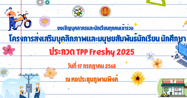 ขอประชาสัมพันธ์ โครงการส่งเสริมบุคลิกภาพและมนุษยสัมพันธ์นักเรียน นักศึกษา ประกวด TPP Freshy 2568 Posted on 24 ตุลาคม 202524 ตุลาคม 2025 by รุ่งกิจ พานิชพันธุ์ ขอเชิญชวนเข้าร่วมกิจกรรม ในวัน พฤหัสบดี ที่ 17 กรกฏาคม 2568 ณ หอประชุมภูพานพิงค์ วิทยลัยเทคโนโลยีเทคนิคภูพาน จ.สกลนคร Posted in ประชาสัมพันธ์.